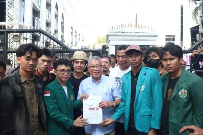 Aliansi Badan Eksekutif Mahasiswa Seluruh Indonesia (BEM SI) wilayah Sumatera Utara (Sumut) menyerahkan hasil kajian tuntutan terkait isu nasional dan daerah kepada DPRD Sumut, Senin (28/7/2025).