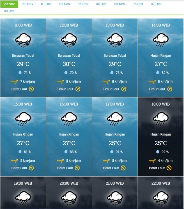 Berdasarkan data yang diterima dari BMKG Wilayah I Medan pada Jumat (29/11/2024), Kota Medan berpotensi diguyur hujan ringan pada siang hari dengan suhu udara sekitar 30 derajat Celsius dan kelembapan udara sebesar 79%.